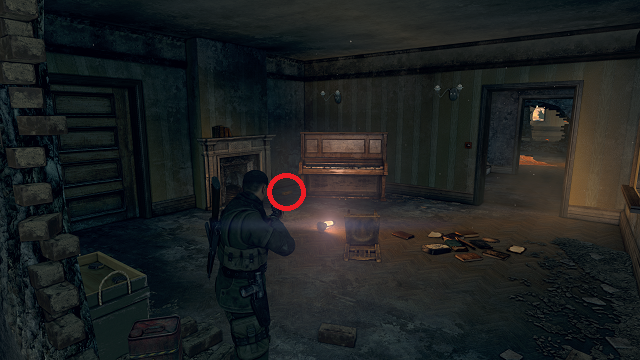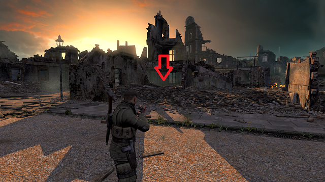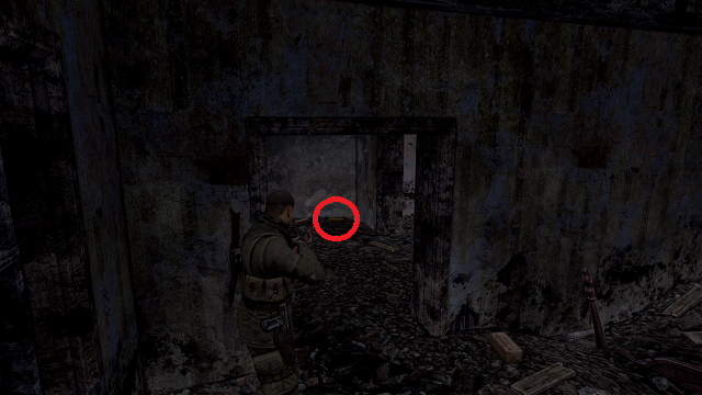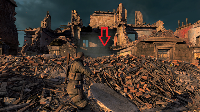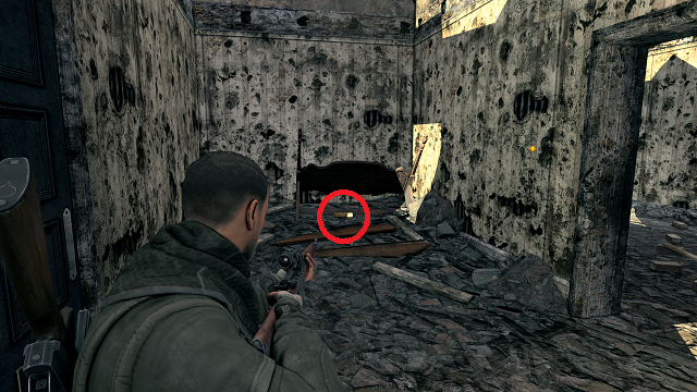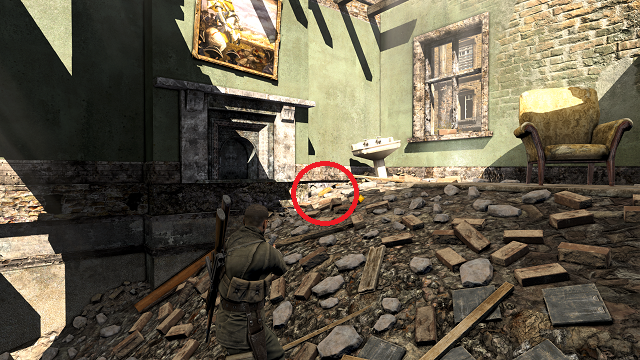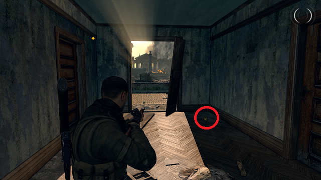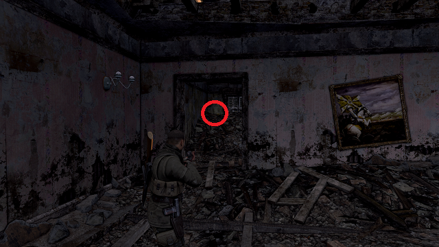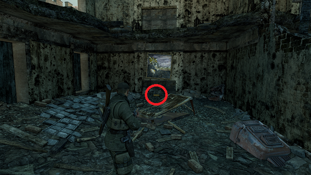 Now backtrack to the objective marker and go into the house it’s telling you to go into. Go up the stairs and follow the path around to the left. Eventually, you’ll come to a dead end. Turn left to find the gold bar on the ground in the rubble.