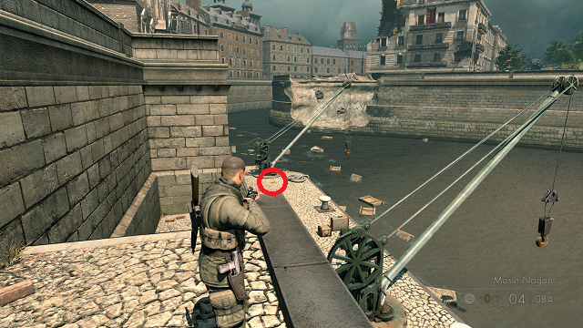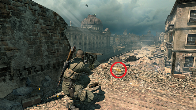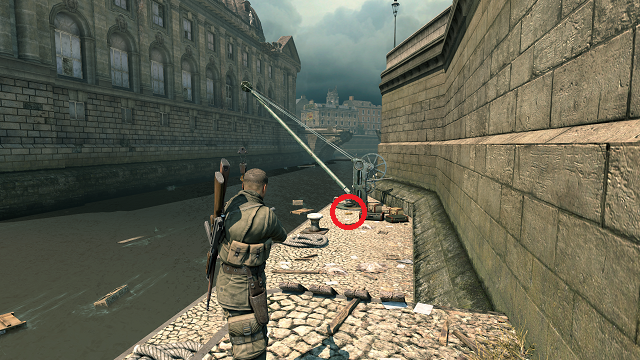 Kill the German soldiers and descend the scaffolding to the street below. Cross the bridge and turn right immediately. The next gold bar is in front of the second crane next to the river below.