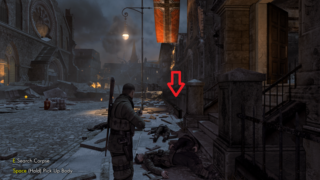 From the second gold bar, take the stairs down into the cellar. Kill the two guards and go outside. Follow the alleyway. As you round the corner, you’ll see a guard at the far end. You can go ahead and snipe him without alerting anyone.