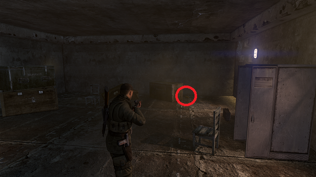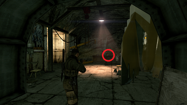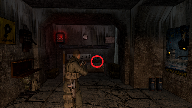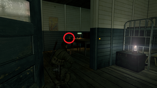 From there, go left and all the way down the corridor to the officer’s bunker. There is a desk there with a kerosene lamp and some papers on it. The gold bar is behind the desk.