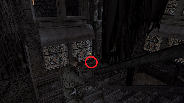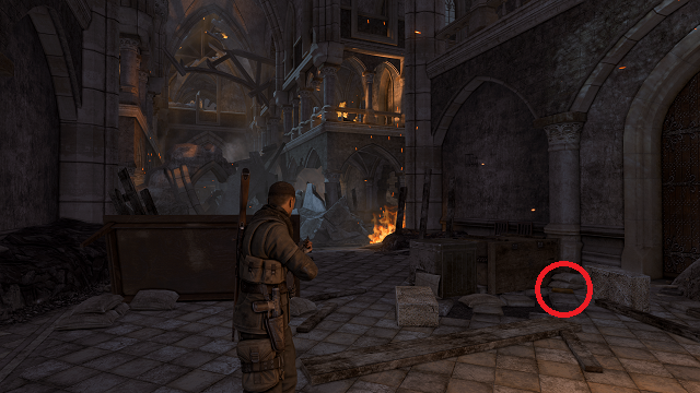 Now enter the church and go straight to the very back. Turn left once you pass the overturned table. The gold bar is on the ground behind the crate.