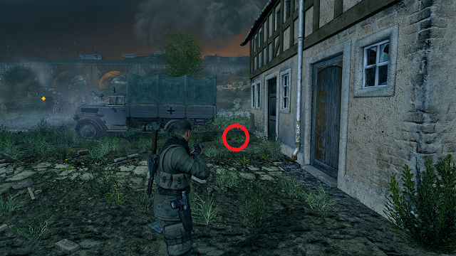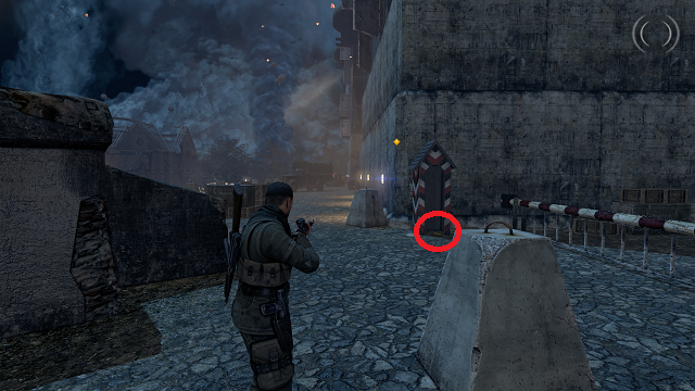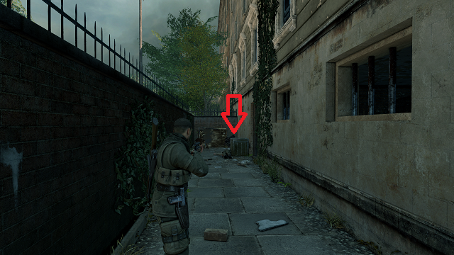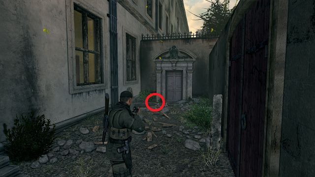 Now turn around and go back the way you came. With the bunker in front of you, go toward the entrance of the building on your right. However, don’t go inside just yet. Instead go into the narrow passage just past it. At the end, you’ll find the gold bar on the ground along the left-hand side.