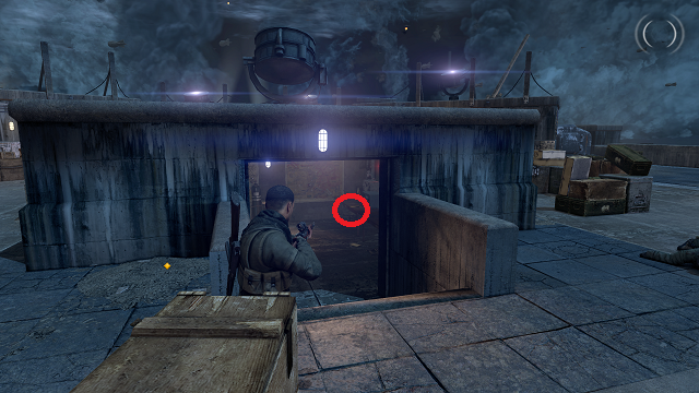 Follow the path and exit the building. You’ll be on the far-left side of the flak tower entrance. There is a bunker directly in front of you. The next gold bar is inside, on the floor, behind a crate.