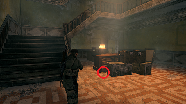 From the last gold bar, continue toward the objective by going upstairs. Follow the path and kill the patrolling guard. Go right and drop down to the left in the next room.
