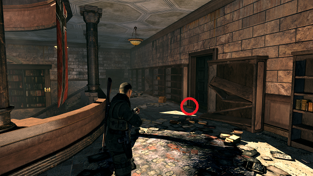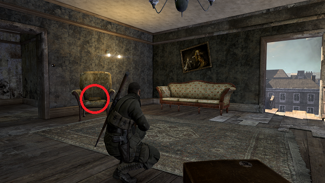 Now turn around and go into the building. Turn left, take out the guard, and continue along the path. When you enter the room with the brightly lit chandelier, turn left. The gold bar is on the ground to the right of the fireplace.
