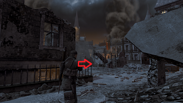 From the beginning of the level, go past the smoldering crater in front of you. There is a ruined car to your right. There is a ruined building across from that.