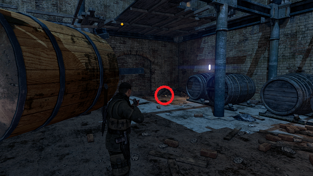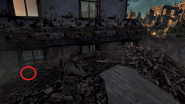 For these next three gold bars, you’ll need to plant the explosives in the previous section to move forward to Schwaiger’s Office. Go toward the office, and go to the top of the scaffolding on the right side. At the very top, go to the V2 rocket in the middle. The gold bar is on the ground next to a toolbox.