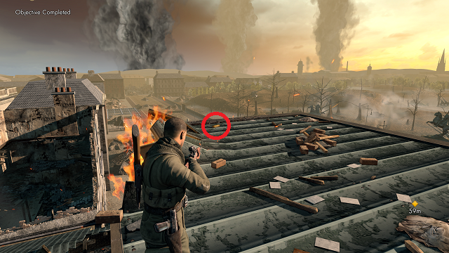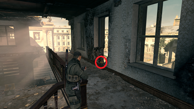 Take out the target and the remaining enemies. Once the area is clear, take a right from the vantage point, go through the door, through the whole in the wall ahead, and descend toward the street.