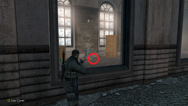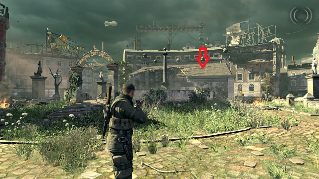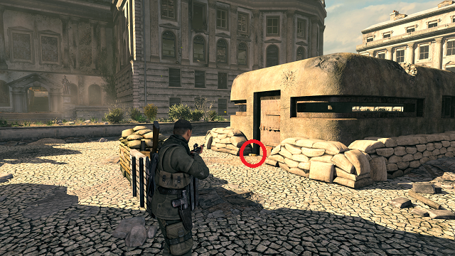 Once you make it out into the courtyard on your way to the vantage point, you’ll notice two bunkers on either side of the huge horse statue in the middle of the area. Go around the bunker closest to you. Go to the side facing the horse statue, and find the gold bar lying on the ground in front of the bunker door.