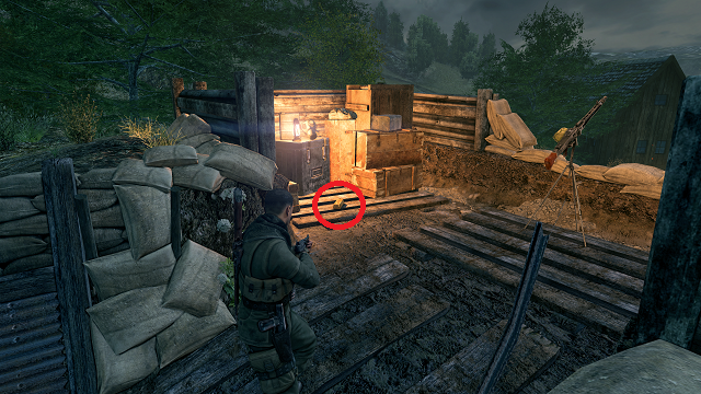 Leave the machine gun nest. Turn left and then immediately right. Go all the way down the path to find the next gold bar on the ground.