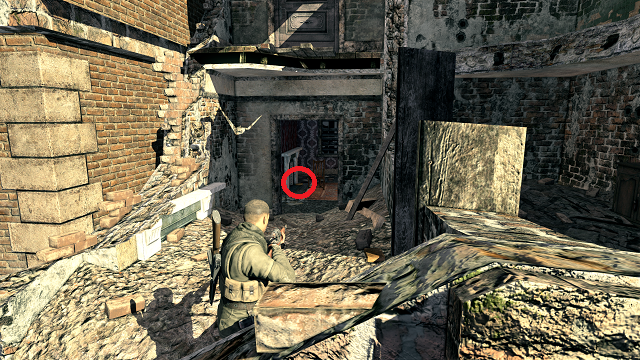 From the beginning of the level, kill the first enemy. Continue past him, staying to the left of the truck. Hug the side of the street and continue forward, minding the two soldiers standing the middle of the road. Go into the building ahead with the propaganda poster on it.