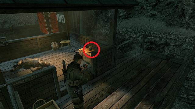 From the last bar, go inside the building to your left. When you enter the main room with the patrolling guard, take him out. There is a counter and some crates to your right. The gold bar is on the floor below the counter and the lamp.