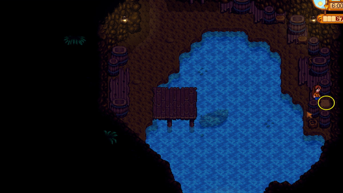 - In the ground on the far right side of the Pirate Cove x1 – Follow the wooden pathway to the east of the starfish tidepool into the Pirate Cove. Then head down to the bottom right corner and use your hoe to dig in the empty spot between the barrels.