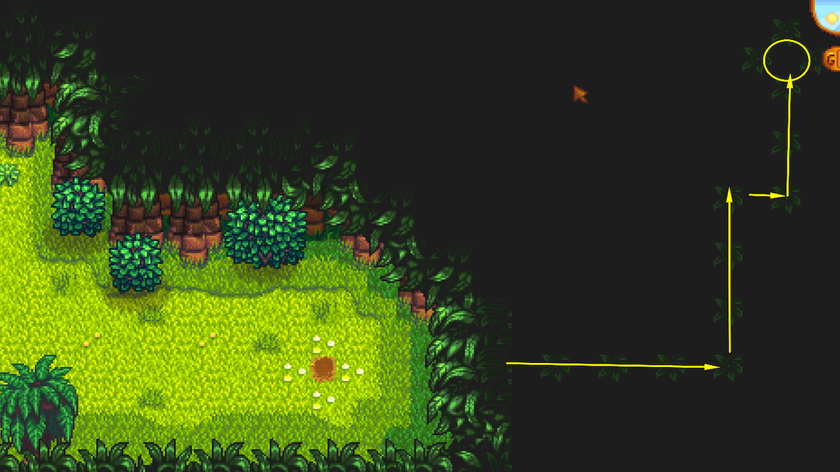 - In a bush on the cliff edge in the Tiger Slime area x1 – Head up the stairs to the Tiger Slime area and immediately turn right. Follow the edge of the cliff down and around, using your pickaxe to break through the rocks. You’ll spot the bush with the Walnut at the edge beside the stream.