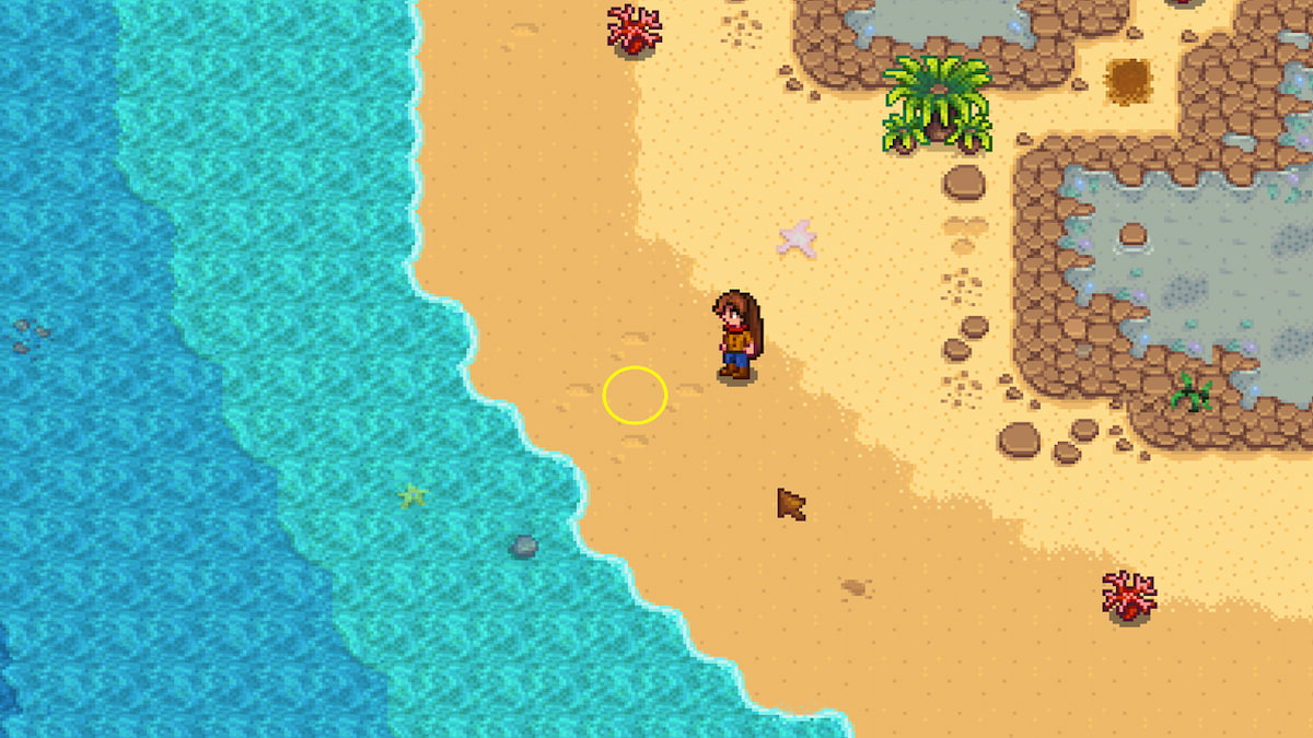 - In the ground between four indentions in the sand, southwest of the tidepools x1 – Use your hoe to dig up the ground in the center of the four indentions.