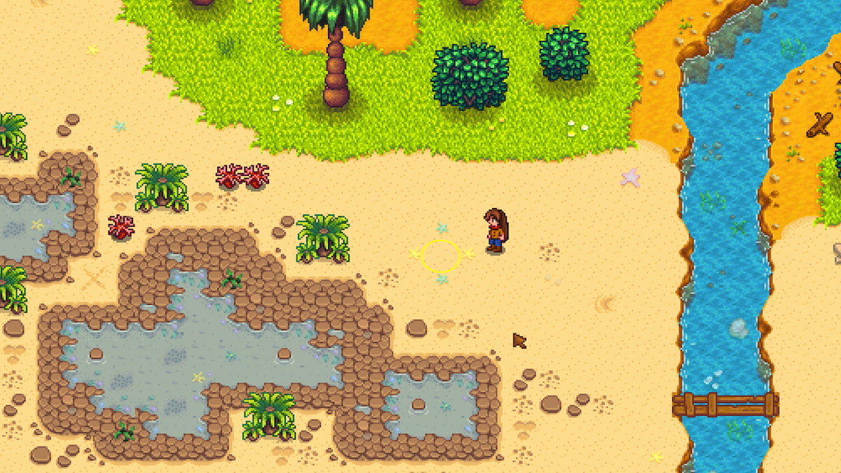 - In the center of two blue and two yellow starfish, above the tidepools x1 – Break the big rock covering the starfish. Then, use your hoe to dig in the very center of them.