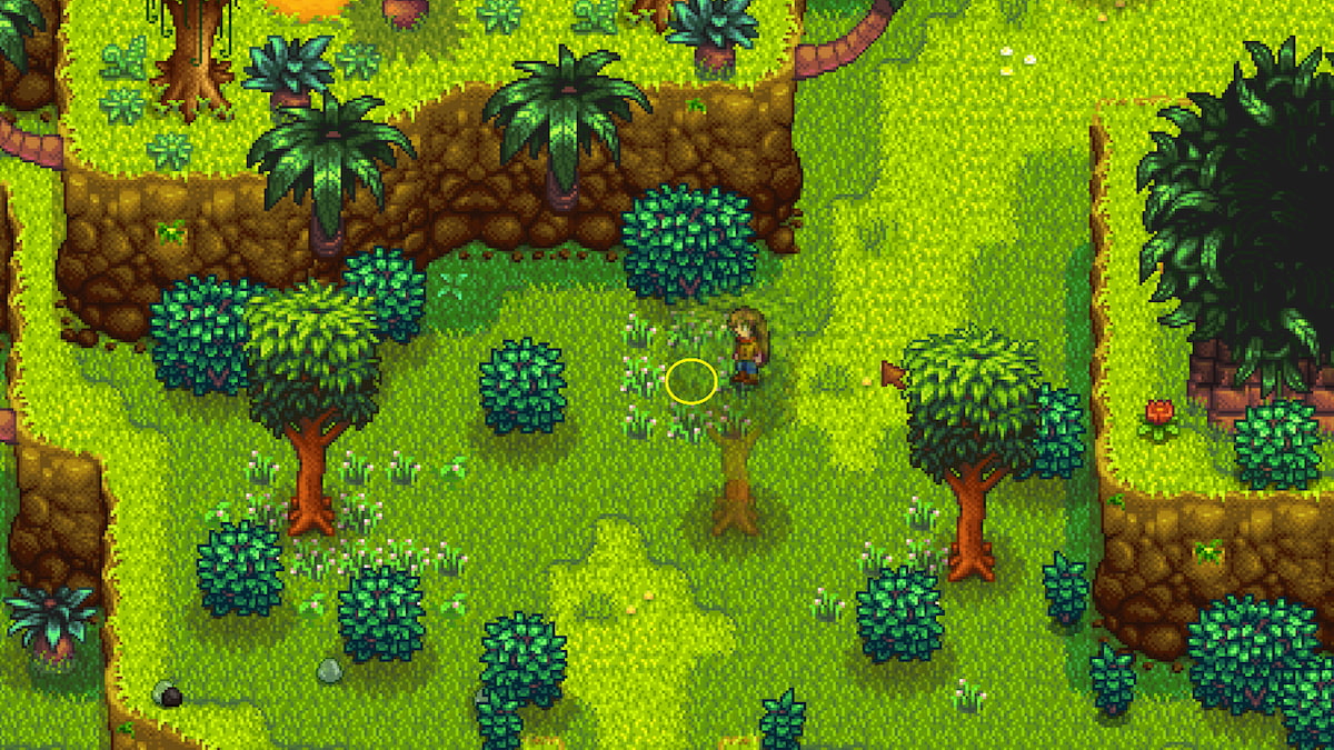 - In the ground in the middle of a circular grass patch, in Tiger Slime area x1 – It’s slightly hidden by a tree. Use a hoe to dig up the ground in the center.