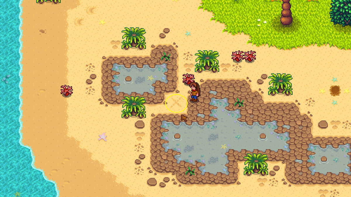- In the ground at the x marks the spot, at the tidepools x1 – Use your hoe to dig up the ground right on top of the ‘x.’