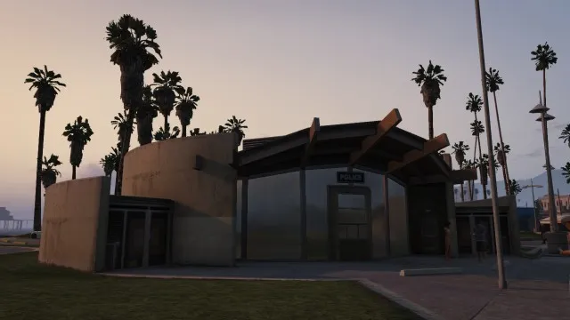 The Vespucci Beach Police Station is a circular complex with a glass exterior. The station is located on Vespucci Beach, near the south side.