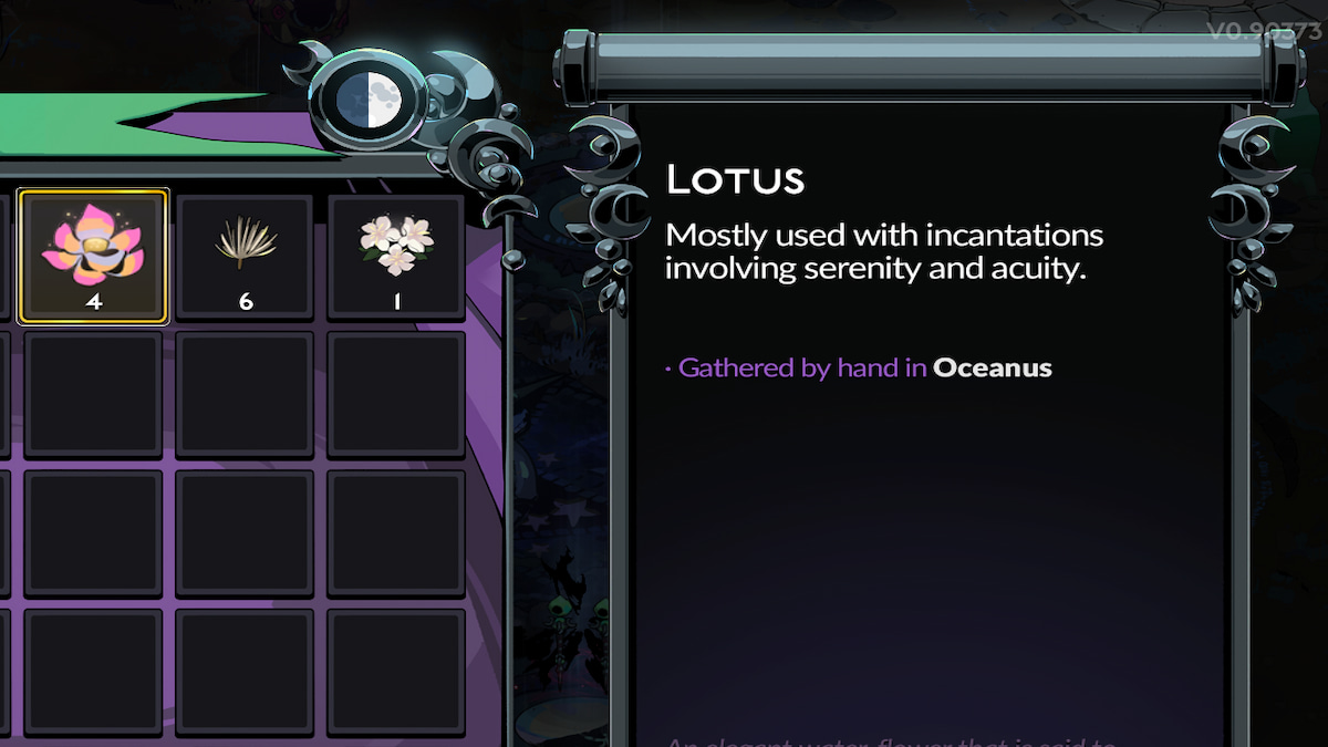 - Lotus: Lotus flowers are found in Oceanus and they’re used in a lot of important Incantations so be on the lookout for them. Some of the most important Lotus incantations are Rich Soil for 3 to unlock more planting spots, 2 Lotus for Unraveling a Fateful Bond to remove HP drain on surface levels, and 1 Lotus for Faith of Familiar Spirits to unlock familiars.