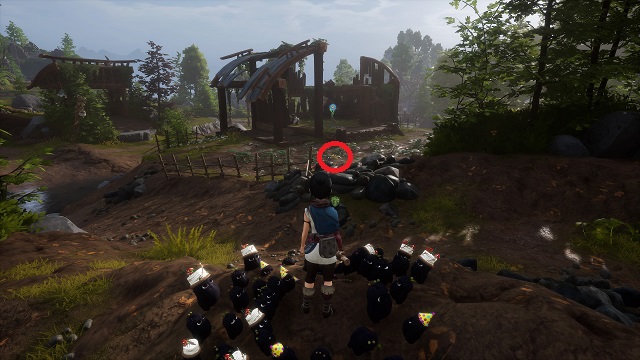 Now go west, toward Rufus’ Barn. You should cross an intact stone bridge just west of the hat cart. Cross it, and turn right. You’ll see a pile of rocks between the water and the road, to the right of the broken wooden bridge. Destroy those for this collectible.