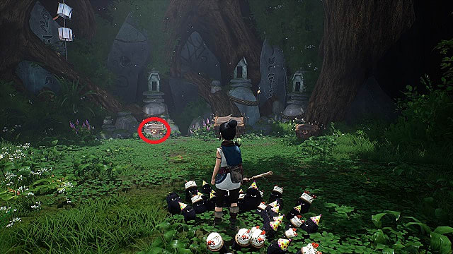 Go back to the main shore with the warp stone, and go right through the large torii gate with the lamps on either side. Defeat the enemies at the end of the oath, and go to the right side of the area to find one hiding under a rock.