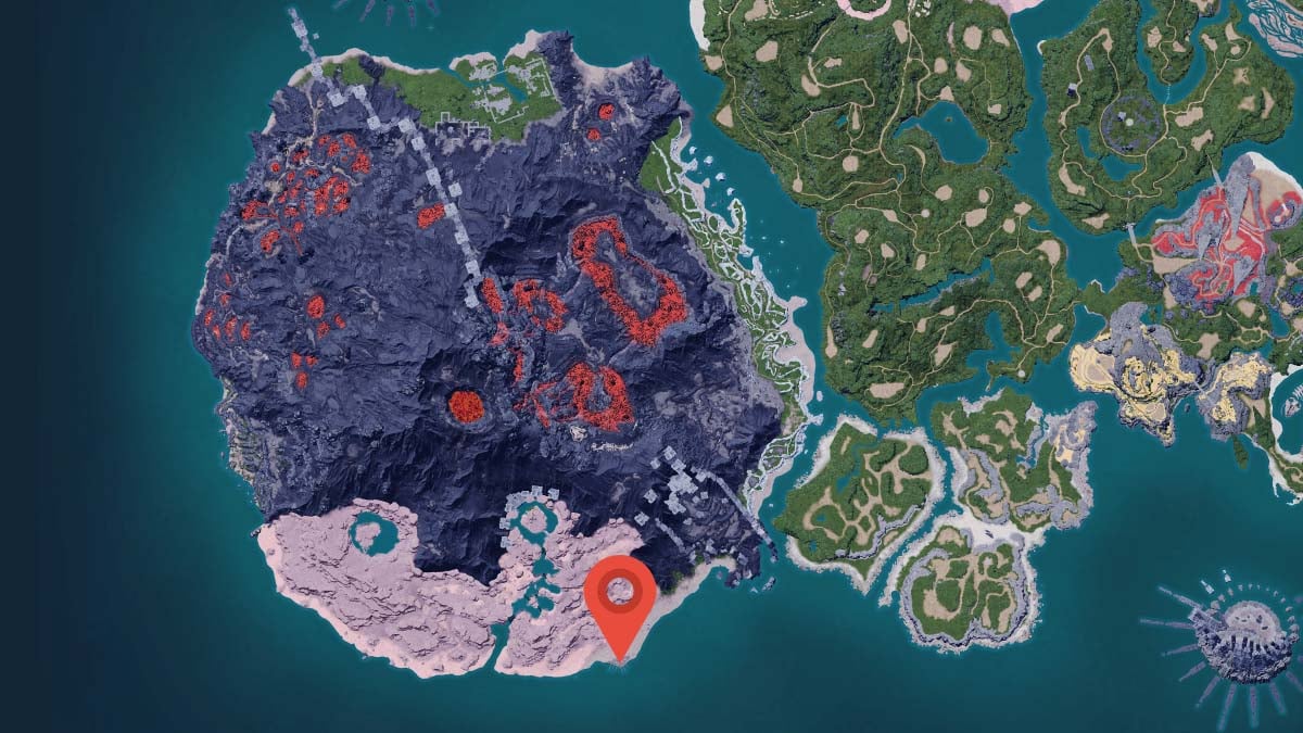 Fisherman’s Point is a large settlement on the southern shore of the Obsidian Mountain at coordinates -456, -759. It’s a true merchant hub, where you can easily find vendors to trade items with. You can also get a Huge Dragon Egg here, which you can place in the Egg Incubator and hatch into a powerful Jetragon pal. These eggs spawn randomly along the cliff edges at Fisherman’s Point.