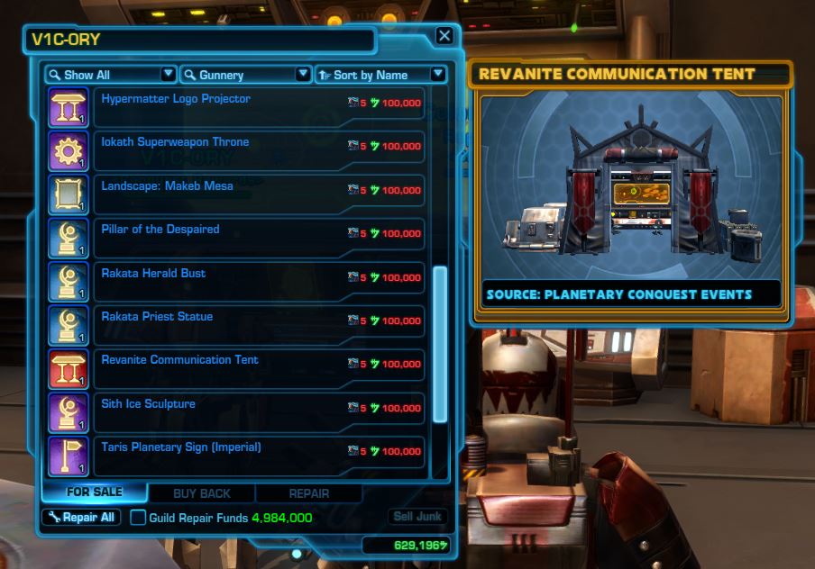 A well-received change with Command Authority is how stronghold bonuses affect player scores. Prior to update 5.8, a player could achieve a 150% stronghold bonus by unlocking several strongholds and filling their rooms with decorations. Strongholds retained a 100% decoration completion that could be satisfied by filling out the maximum allotment of decoration hooks, which contributed a 25% stronghold bonus toward the overall 150%. Players took advantage of this feature by purchasing cheap decorations, such as Basic Metal Chairs and Basic Junker’s Lights, from the decoration merchants; however, update 5.8 has removed decoration hook requirements and instead bases a player’s stronghold bonus on the number of strongholds and rooms unlocked. The Coruscant Apartment, Kaas City Apartment, and Umbaran Mobile Base are the cheapest and easiest to fully unlock (granting a 75% stronghold bonus).