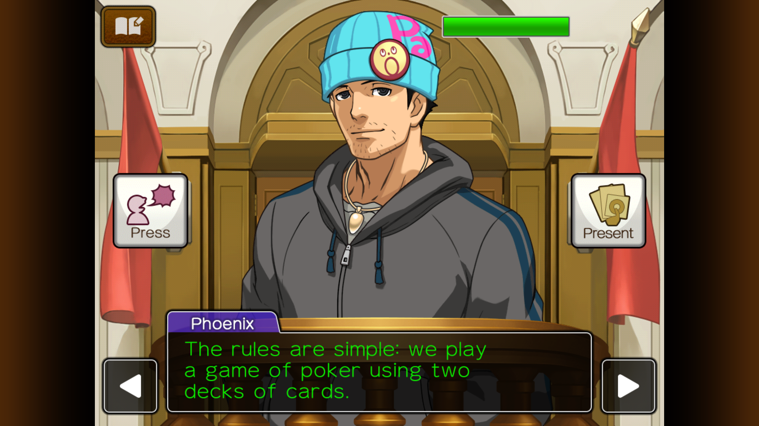 Two decks of cards? Why two decks? For a statement as innocent as the rules of the game, it sure does smell fishy. Press him here to learn more. Pressing all three of these statements triggers a discussion in the courtroom that leads to the defendant, Phoenix, amending his statement.