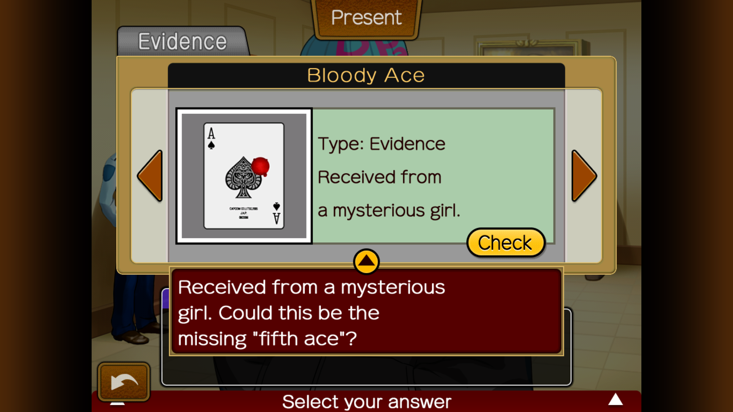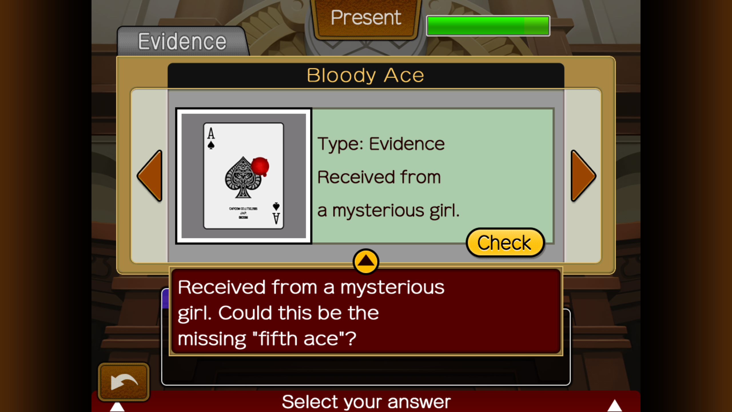 After the trial concludes, Wright admits he forged a piece of evidence and asks if you can figure out which one. Present the Bloody Ace his daughter gave you during the last recess. He admits that the killer took the fifth ace to destroy the evidence and so it was nowhere to be found. However, I think we can forgive his small slight, just this once.