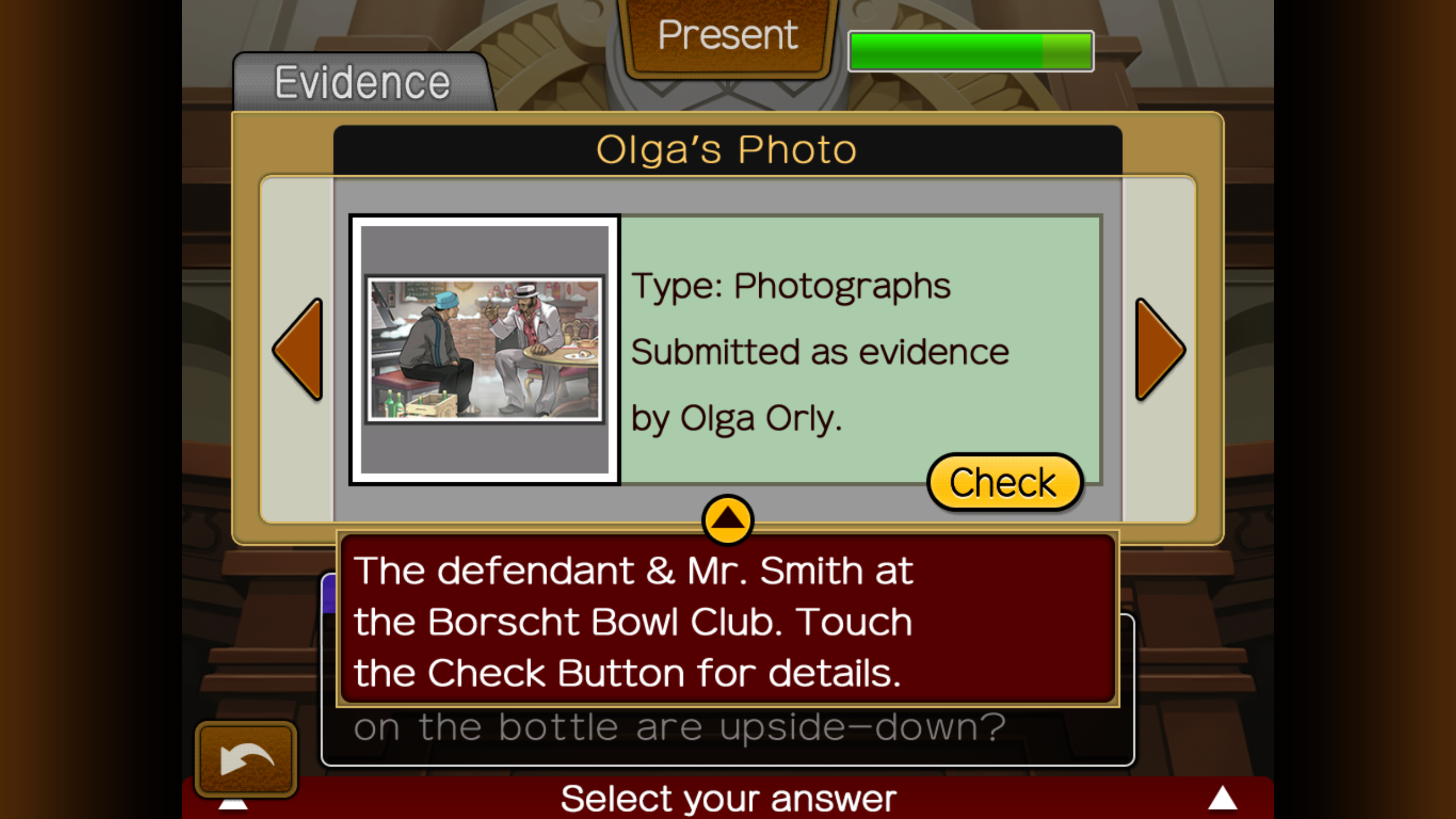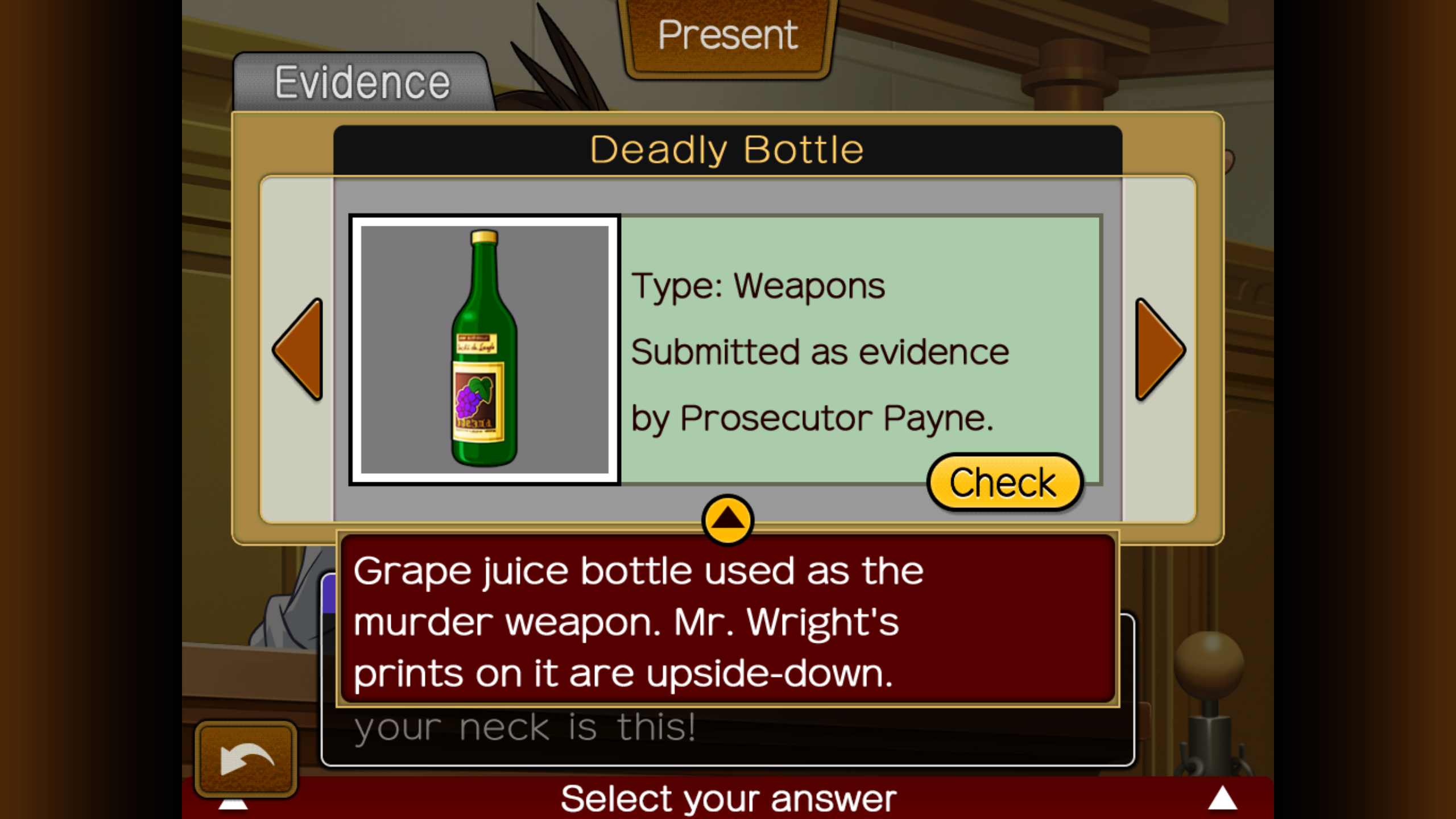 In an act of desperation, Kristoph reminds the court about Phoenix’s upside-down fingerprints on the murder weapon. If you look at Olga’s Photo, you’ll notice that the defendant is sitting next to a box of grape juice bottles. Were he to reach down and pick one up, his fingerprints would naturally appear upside-down. Present Olga’s Photo to the court as a reason for Mr. Wright’s upside-down prints.