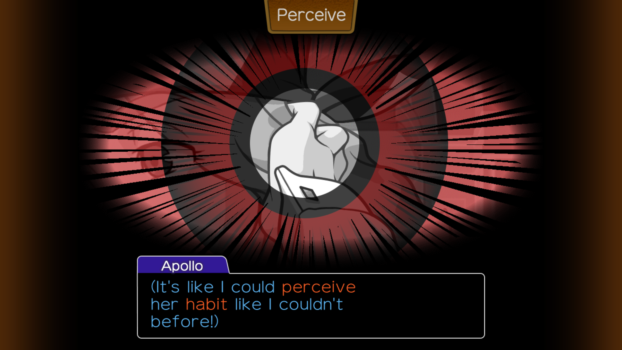 Apollo notices something odd: she touches her neck during certain parts of her testimony. Perceive this to call her out to the court.