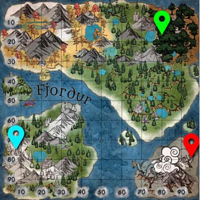 The three Obelisks spread across the Fjordur map, indicated by their corresponding colors at the following coordinates: