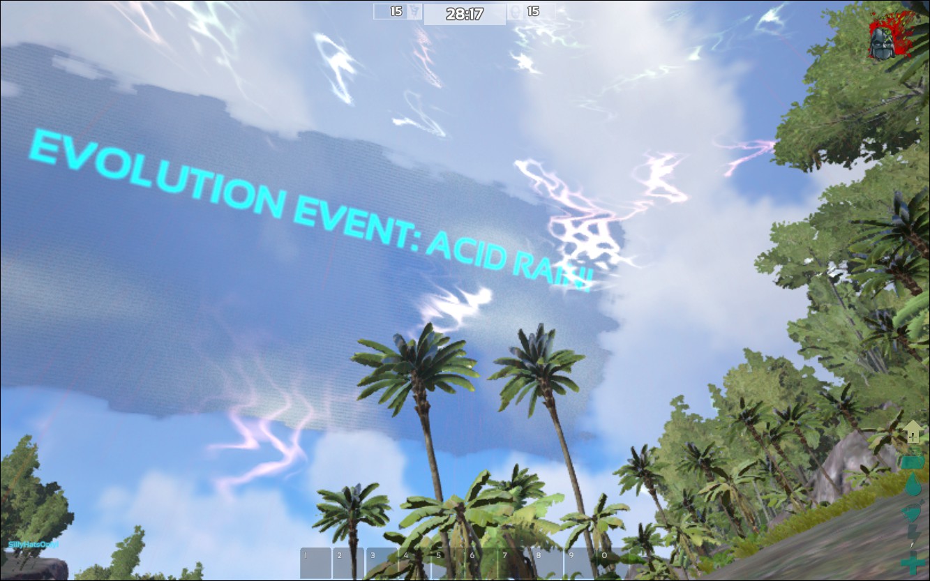 - Acid Rain – Damaging rain falls from the sky across the island, destroying your equipment and lowering your health (although it won’t actually drop you to 0 health). To avoid the rain, get underneath rocks or build a shelter to hide in.