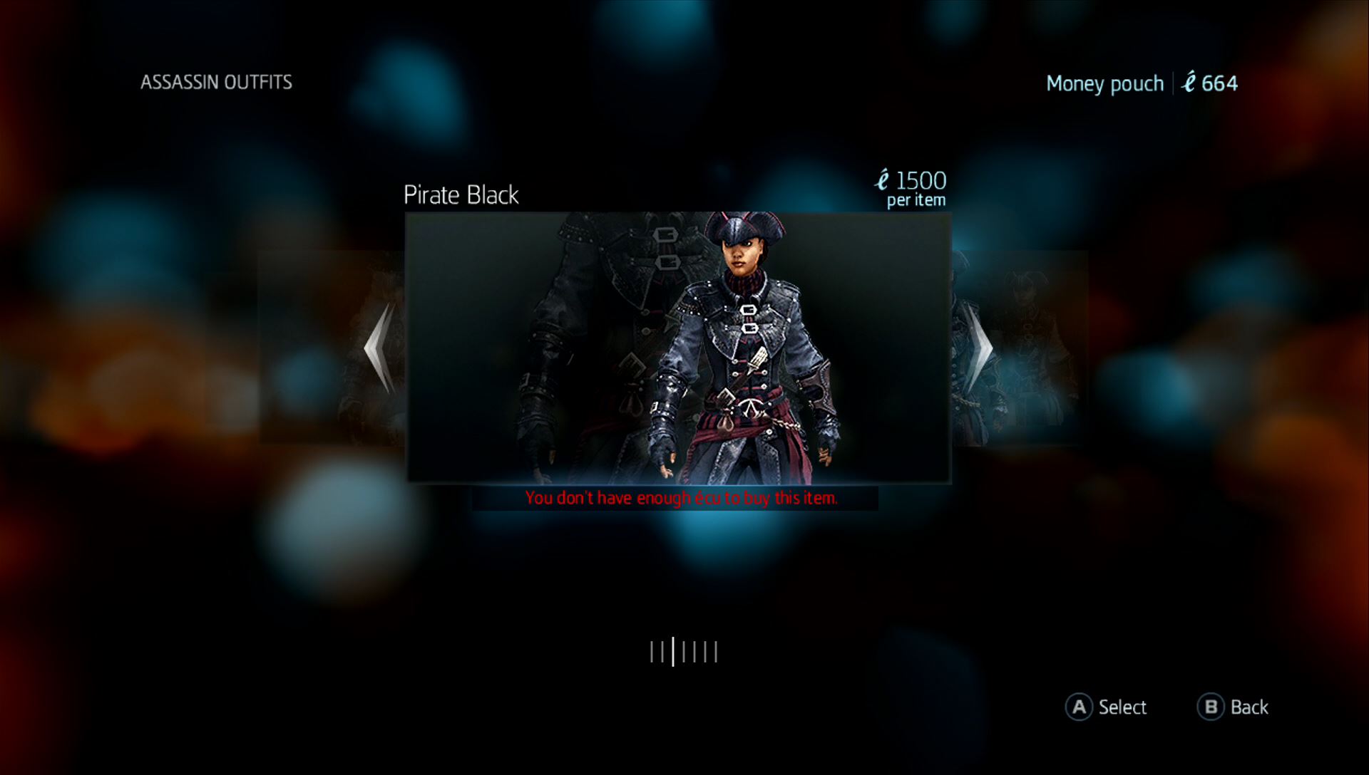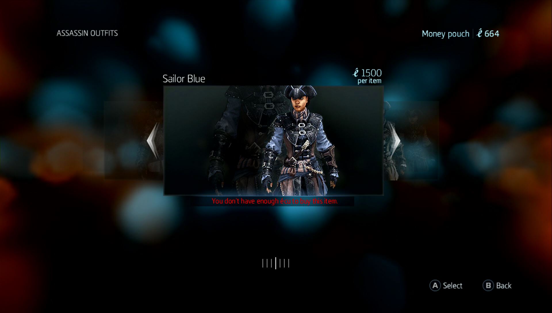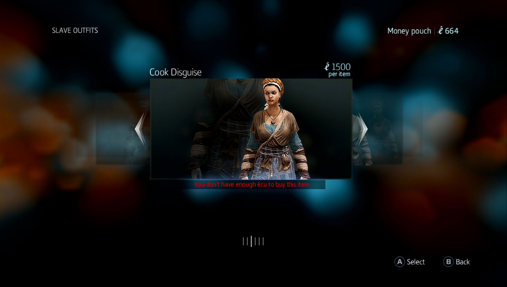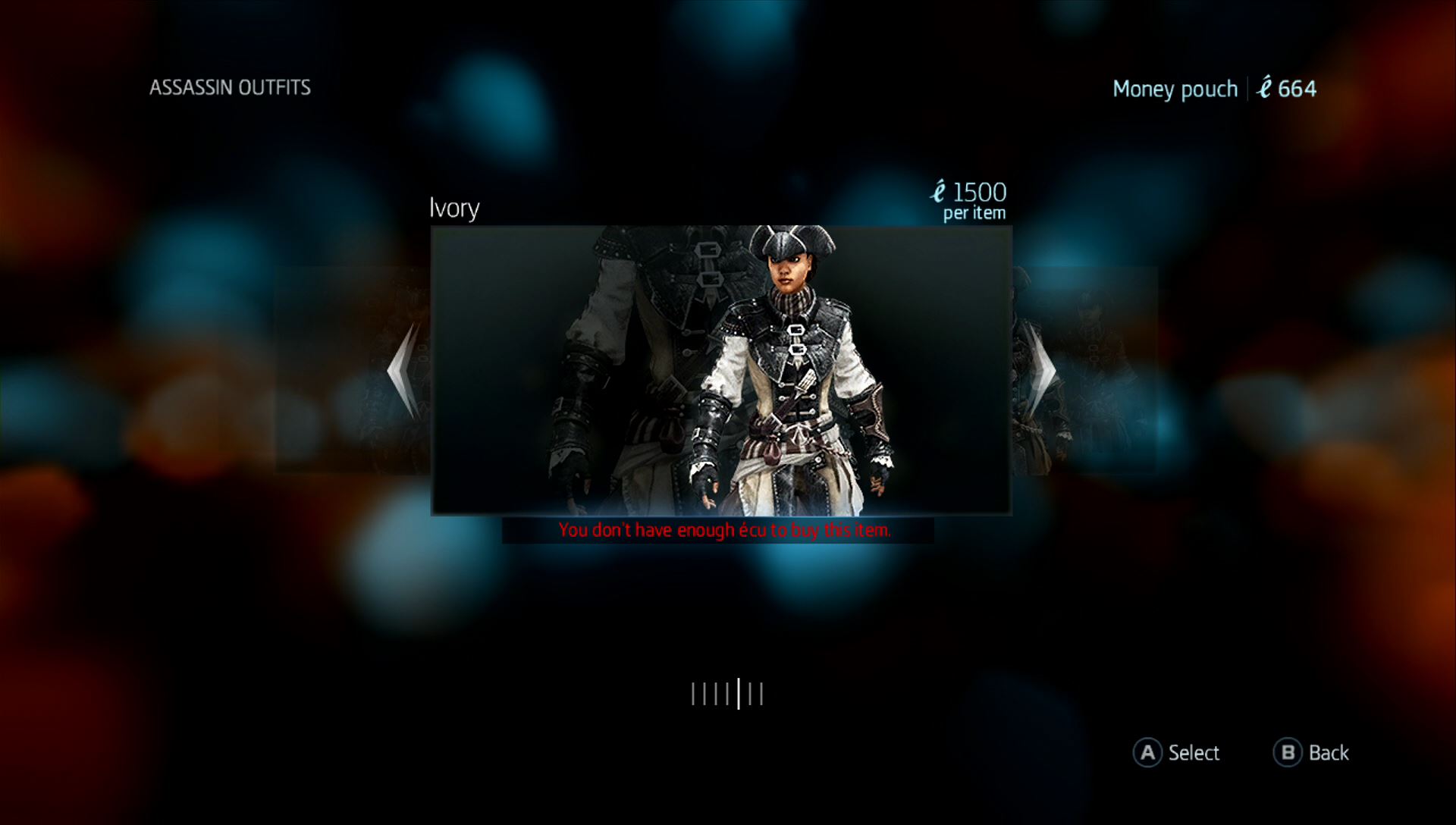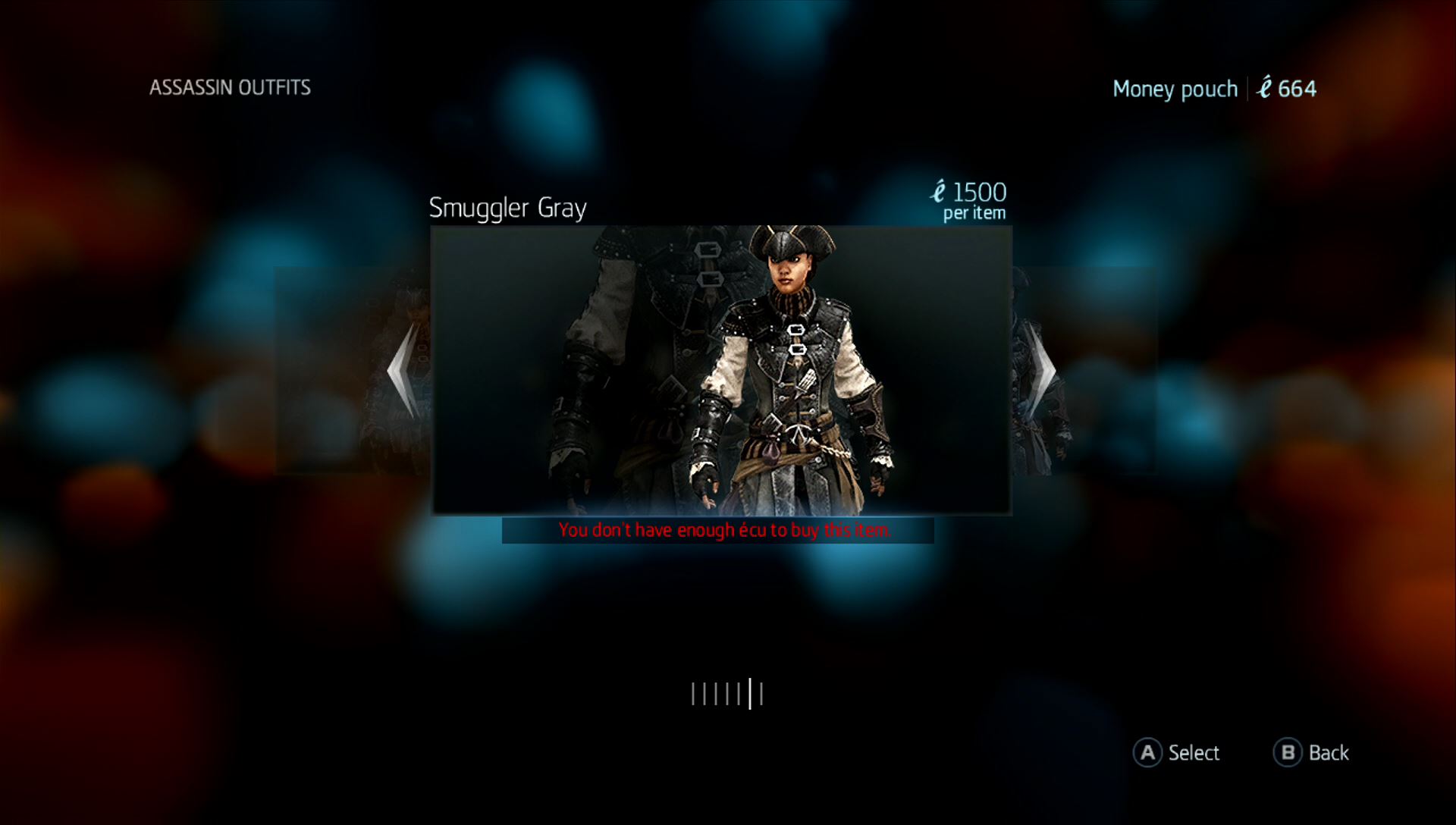 Assassin's Creed Liberation HD provides a lot of customization; most of it turns out to be purely cosmetic, however there are a few functional upgrades such as a cartridge pouch upgrade early game. All items are purchased with écu.