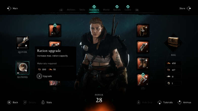 Rations are located in Eivor’s Inventory menu along with gear, weapons, and other resources. You can upgrade the Rations pouch up to six times, and each upgrade allows for one additional Ration to be stored away for when you need to heal.