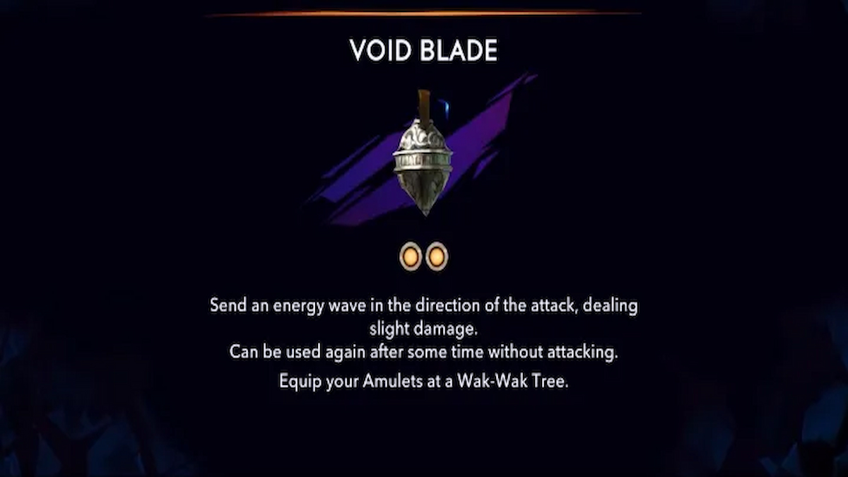 Void Blade requires 2 amulet slots and is amazing for chip damage. It gives you another ranged option, sending an energy wave in your attack’s direction. Keep in mind that it has a cooldown period; you can’t spam attacks. The damage it deals increases, and the cooldown decreases, as you upgrade the amulet. It’s found in a chest at the top of the massive room in the Upper City. You’ll need Gravity Wings to reach it.