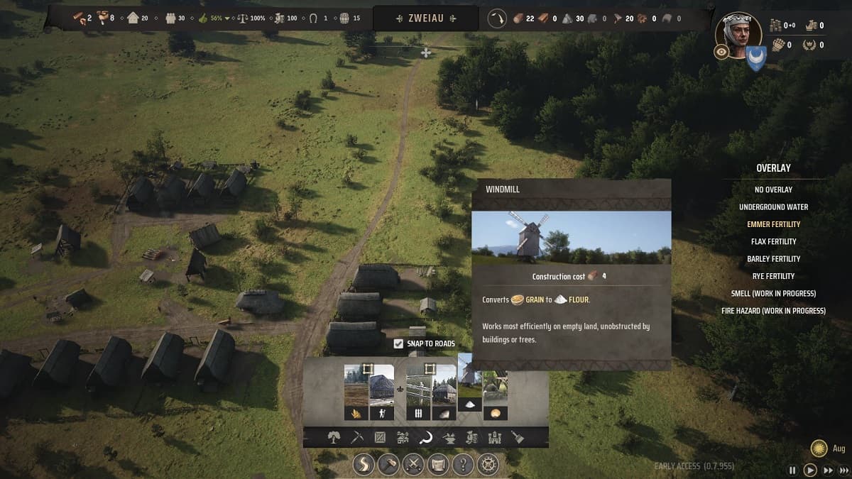 When you prepare to place your fields, the Fertility Overlay helps you choose an optimal location. There are three primary overlays that you want to use: Emmer (Wheat), Barley, and Flax. While a green area is the best option, yellow fertility is also viable. As you start out, avoid making your fields too large. When placing fields, you can see the measurement of size in Morgens. One family assigned to a farm can only tend a little over half a Morgen each year.