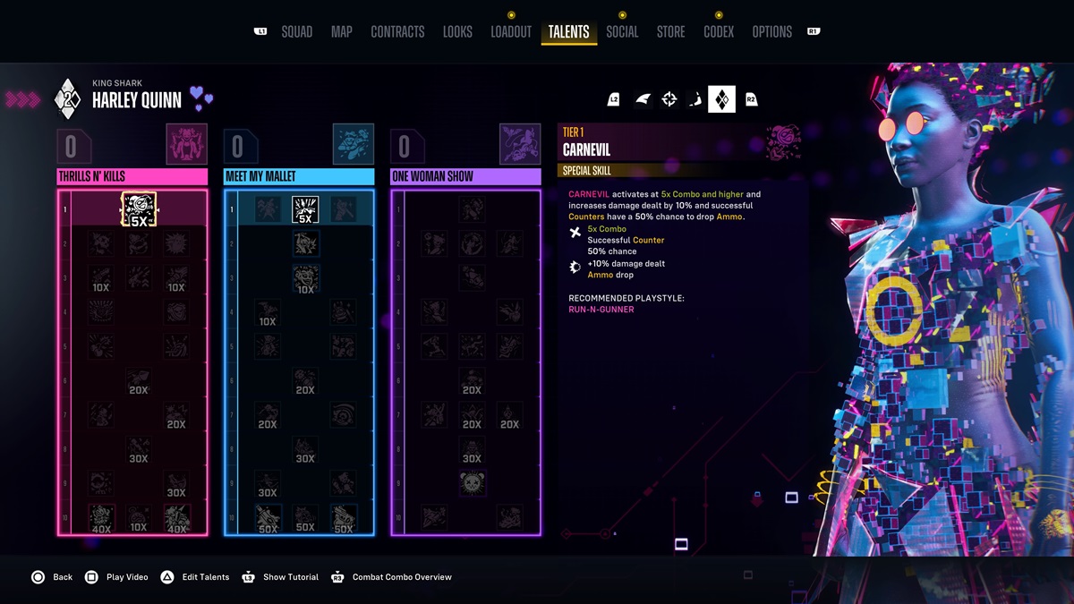 The Talent Tree can be daunting. There are three categories to tackle, and they all unlock independently throughout your time playing. If you choose to main Harley, focus on airborne abilities, combos, and grenade damage. If you think you messed up your build, don’t fret, you can edit your skills at any time. Here’s my recommended talent tree path for Harley Quinn.