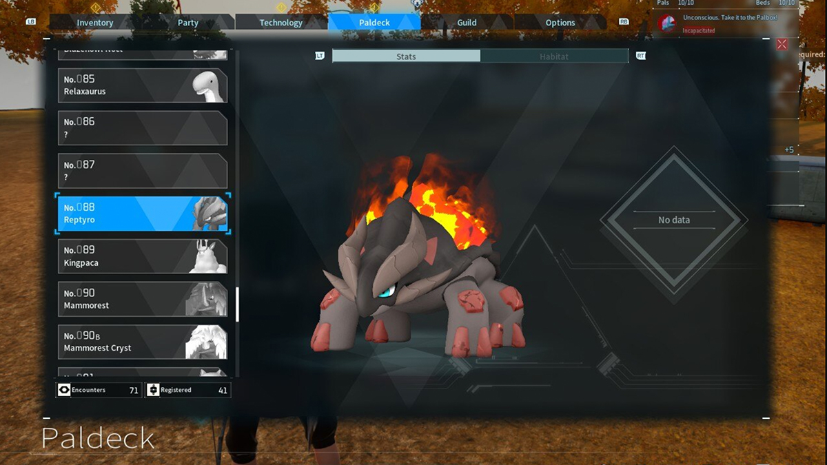 Reptyro is one of the most useful Fire-type Pals with Lv. 3 Kindling and Lv. 3 Mining. You won’t need the Kindling skill constantly, so once it’s done with those tasks, it’s just as effective when assigned to the Stone Pit or mining Ore. To capture it, you’ll need to travel to the volcanic region on the west side of the map. However, it’s worth the trek. There you’ll find plenty of Fire Pals, the Fisherman’s Point Settlement (-480, -744), and Alpha Pals like Jetragon and Blazamut.