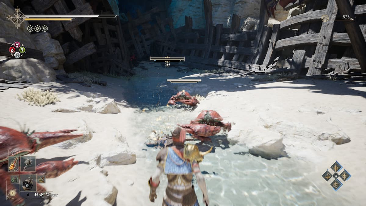 These crabs are hiding in the sand, so you’ll need to wander through the barracks to have them appear. There are four in total in this location. Once you reach the Necropolis Reality Knot, respawning these crabs becomes much easier.