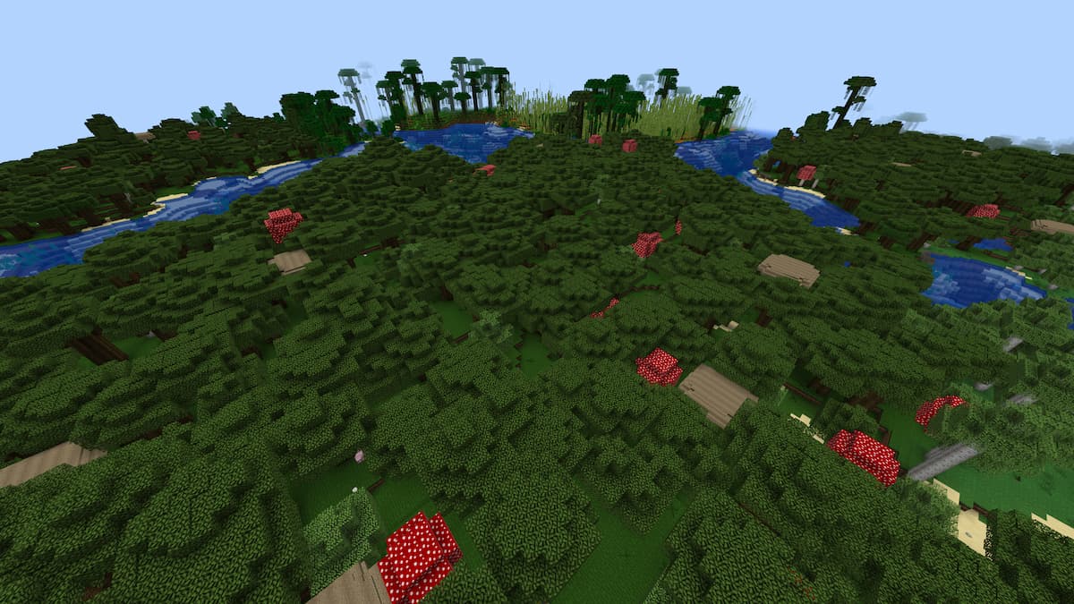 What’s better than one Dark Forest? Multiple tiny islands of Dark Forest biomes, of course! You’ll spawn on one of these islands, and if you get to some high ground, you’ll notice islands all over the place. Right in the middle of all of them is a giant stone peak and a lot of cool natural structures — and mushrooms!