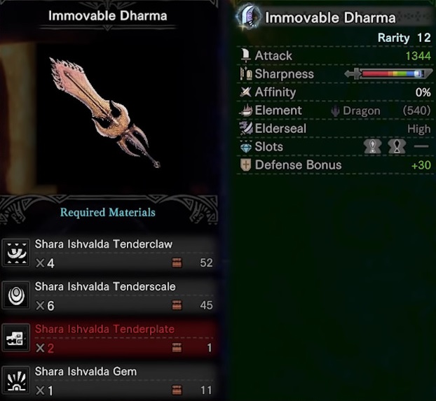 This greatsword can be crafted by farming items from none other than Ruiner Nergigante, which is the reason for such high dragon damage. The crafting recipe is the following: