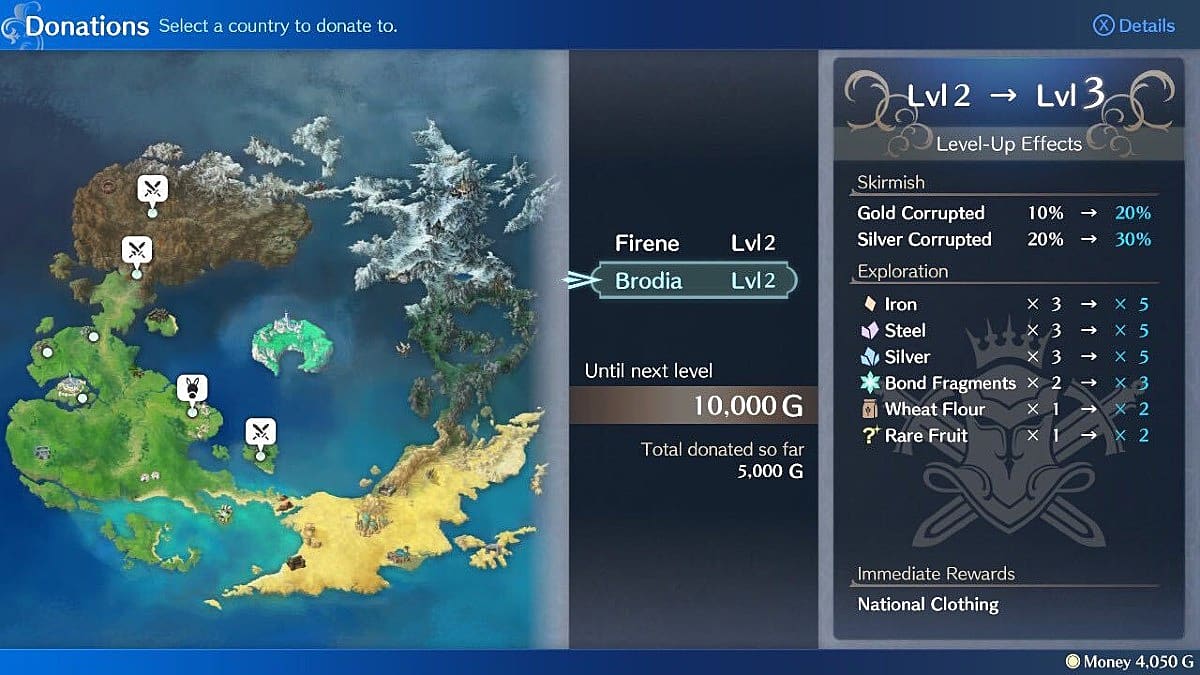 Donating Gold to countries has a knock-down effect on improving the rewards you get from Skirmishes, so basically, you’ll need to invest money to make more. Simply having a higher country level will help, in general, but having a higher level can make it more likely for Gold Corrupted to spawn during Skirmishes.