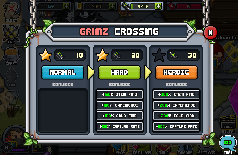With two level 20+ characters on your team, you can easily grind through the first zone to power level. Once you get your level up, the best way to grind is to do heroic runs. You’ll get more of everything in terms of bonuses, and it’s the best way to get those familiars to notice you.
