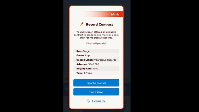If you’re not having great luck, you can also do a Band Audition. A record label is more likely to take you when you decide to go solo if you’ve been in a band. It’s possible to get into a Solo career through persistence and yearly auditions, but these methods can make it easier. You also need to keep an eye on record contract offerings because the genre must be Pop for this challenge.