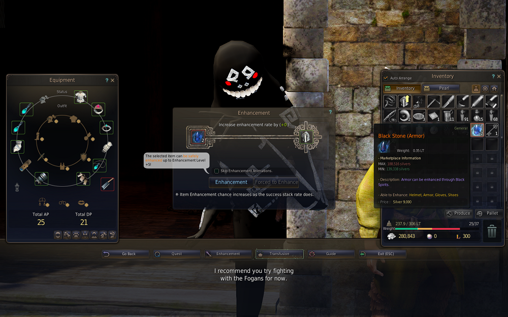 When you have the ability to select Enhancement from the Black Spirit, you can start enchanting. There are a few things you need to know about each piece of gear when doing this.