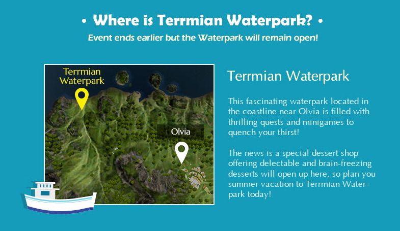 You will find the location of the Terrmian Waterpark on the coastline to the north-west from Olvia. As soon as you arrive at the beach you will notice an area surrounded by the palm trees and inhabited by many NPCs.