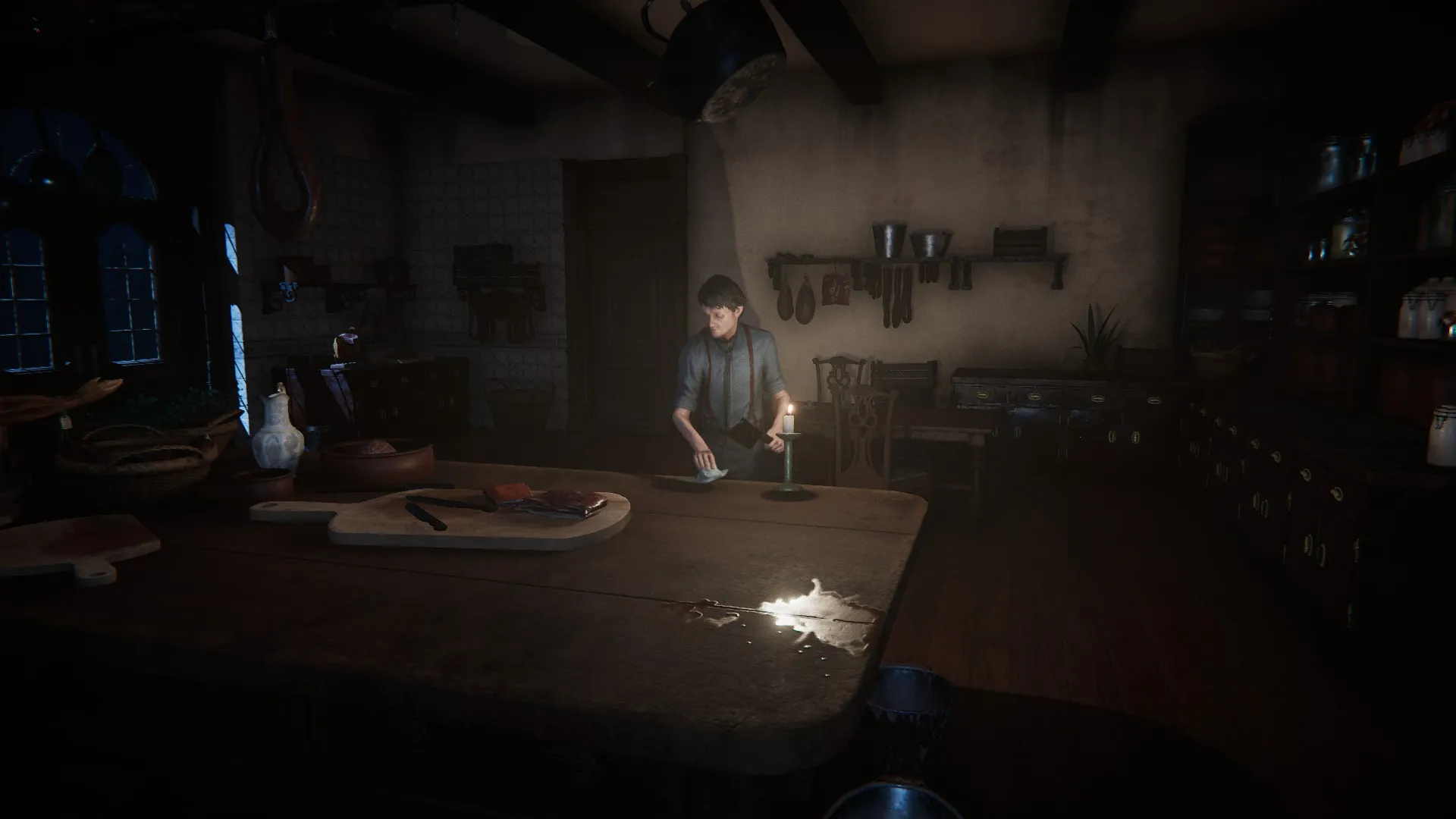 When you enter the foyer, follow the wall to your character’s right until you come to some French doors. Go through them and follow the hallway to the kitchen, where you’ll find a creepy, old, blind guy by the name of Rory. This is the house gardener. Talk to him for a bit. He’ll finish eating and leave.