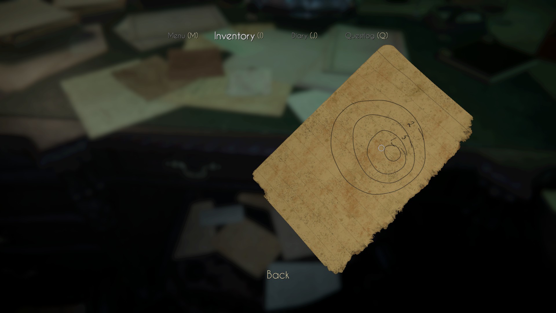 The first clue you are given sits on top of the chest. It’s a note with a few random words on it. If you flip it over (by clicking on it with the mouse and dragging), you’ll find a code as well. Put the paper away and you’ll be given the option to open the chest.